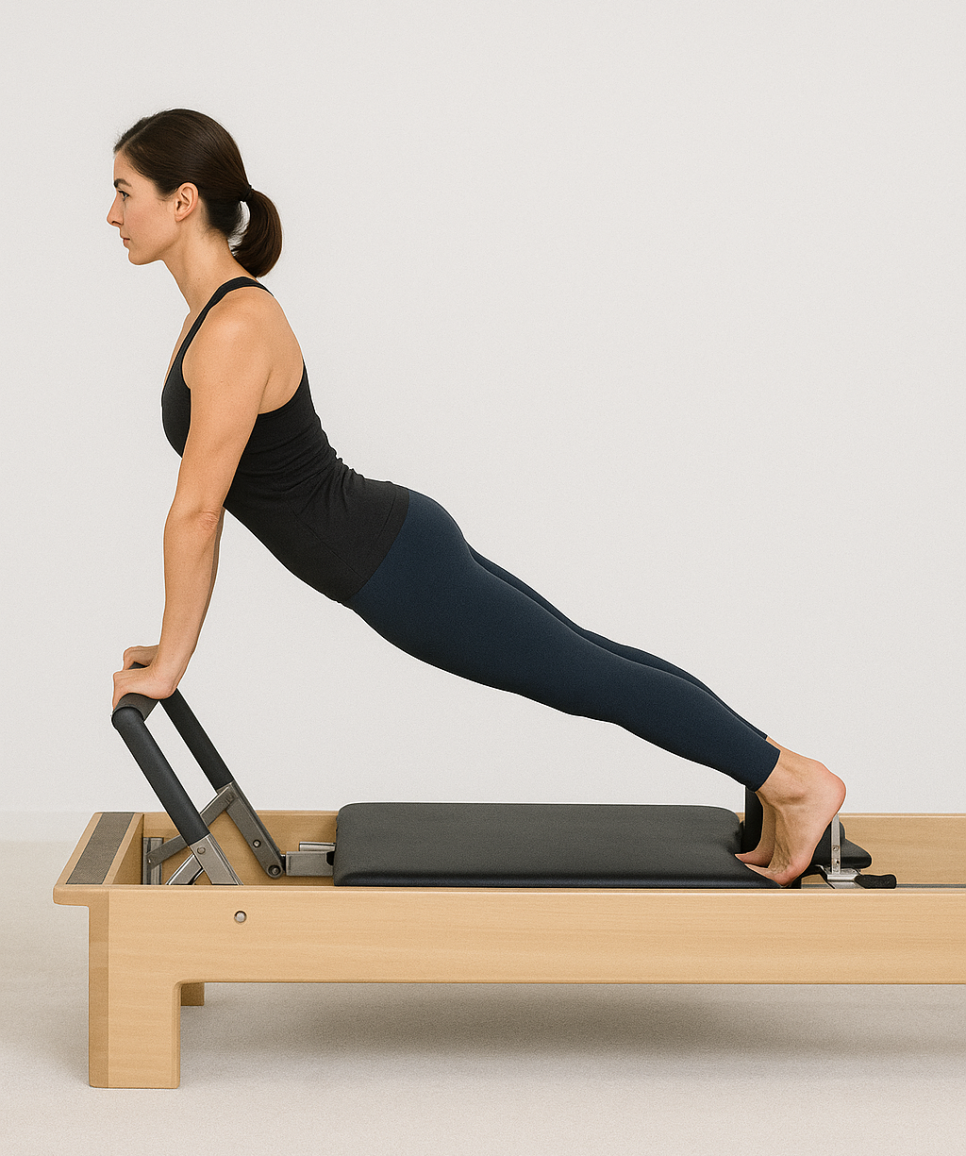 동작 방법: 푸시업 자세로 리포머 위에 올라서서, 팔과 다리를 곧게 편 채 카리지를 앞뒤로 움직입니다.