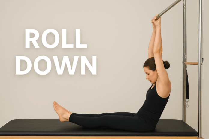 방법: 캐딜락 상단에 있는 롤 다운 바를 잡고 척추를 한 마디씩 바닥으로 내리듯 굴리며 내려갑니다.